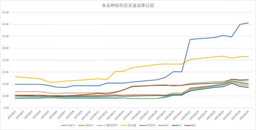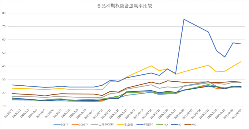 8月市场迎来加速上涨行情,各主要品种的波动曲面均呈现显著的正偏状态。其中,科创50和创业板的波动特征尤为突出: